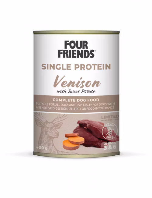 FourFriends Single Protein våtfoder passar alla vuxna hundar men är speciellt utformat för hundar som har överkänslighet mot vissa råvaror eller en känslig mage. Receptet innehåller inte GMO, socker, soja, spannmål, onödiga tillsatser eller kemiska konserveringsmedel. Endast en animalisk proteinkälla, vilket underlättar valet av produkt för den känsliga individen.