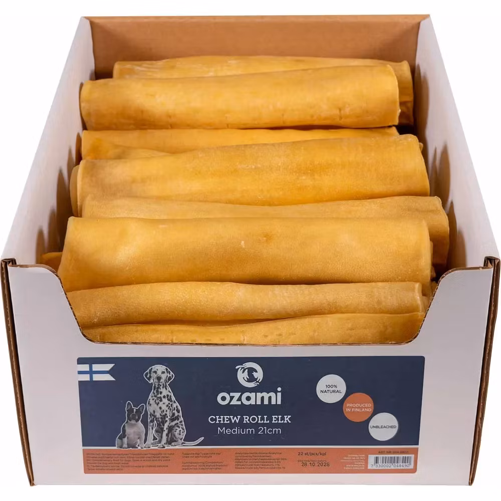 En robust tuggrulle av älghud som handrullas med fokus på kvalitet och trygghet. Varje rulle rullas för hand av ett finskt familjeföretag med genuin hantverkskunskap. Huden lufttorkas och rullas utan kemiska tillsatser eller blekning. Råvarorna hämtas främst från Norden, men kan kompletteras med noga utvalda råvaror från EU vid behov. Resultatet är en naturlig tuggprodukt som passar hundar som gillar att tugga länge och som föredrar rena, obehandlade råvaror.